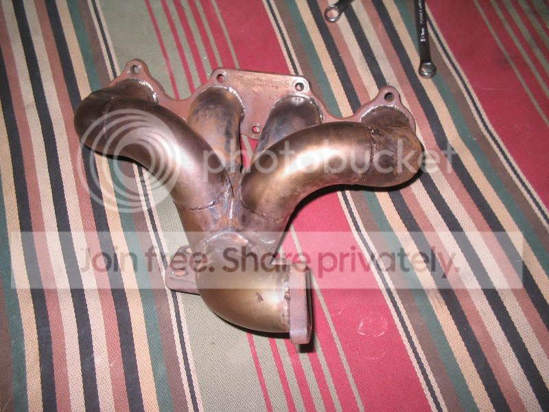 im moving on to a different manifold here shortly and will not be needing this one. it was made by rcautoworks. pretty nice manifold. beveled flanges, solid welds. ill throw in the dumptube and the downpipe. there not real pretty but they worked fine for me. i plan on hitting up the mani with a wire wheel to get off the surface rust. it is stainless, the flanges are mild steel.